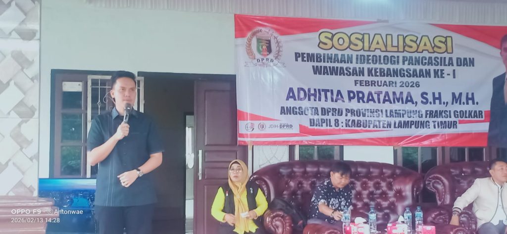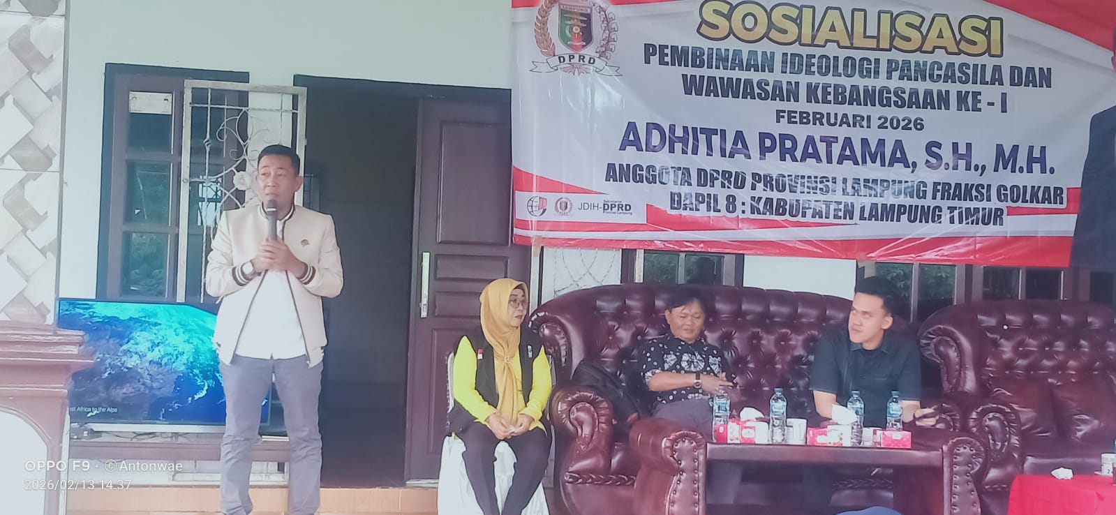Acara sosialisasi secara resmi dibuka oleh Anggota DPRD Provinsi Lampung Fraksi Golkar, Adhitia Pratama, S.H., M.H. Dalam sambutannya, Adhitia Pratama menegaskan pentingnya pembinaan ideologi Pancasila sebagai fondasi utama dalam menjaga persatuan dan keutuhan bangsa, khususnya di Provinsi Lampung.
